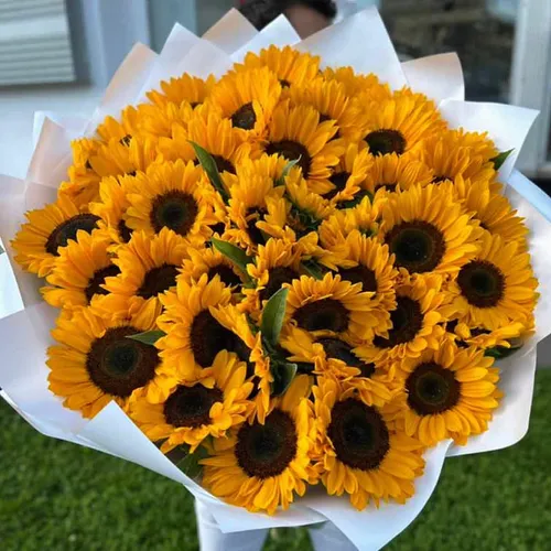Sunshine Symphony — это настоящий гимн свету и гармонии. Букет из 19 крупных подсолнухов создаёт ощущение солнечного сияния, будто вы...
