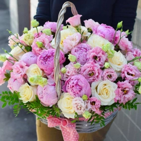 Очень нежный букет из розовых пионов сорта 'Sarah Bernhardt' в сочетании с кустовыми розами и декоративной зеленью. Эта композиция наполнит...