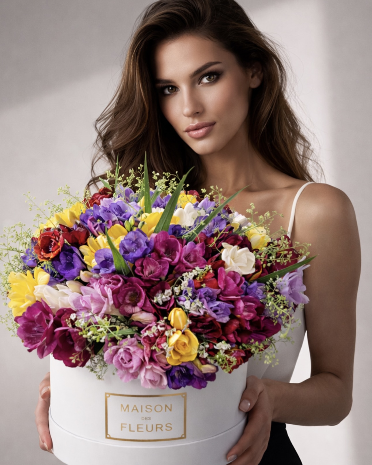 Разноцветная фрезия, декоративная зелень, подарочная коробка "Maison des fleurs"