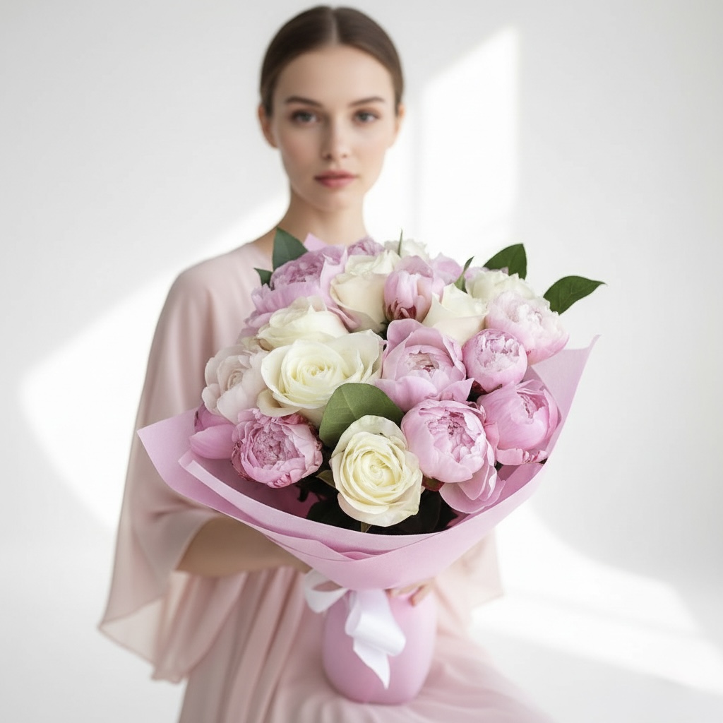 Пионы "Sarah Bernhardt" 10 шт, белые розы 7 шт, розовая упаковка (флизелин), атласная лента