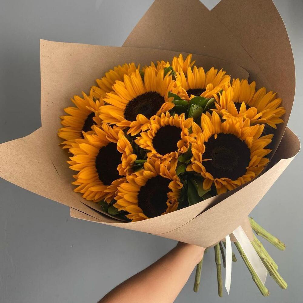 Sunlight Embrace — это букет, который будто несёт в себе частицу тёплого летнего дня. Девять крупных подсолнухов собраны вручную, дополнены зеленью и оформлены в нежную крафтовую упаковку с акцентом на естественную красоту каждого цветка.