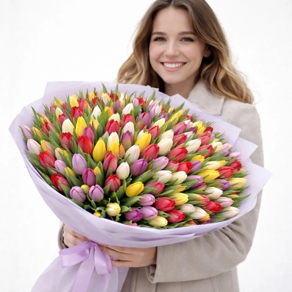Тюльпаны микс (разных цветов в букете), упаковка, атласная лента