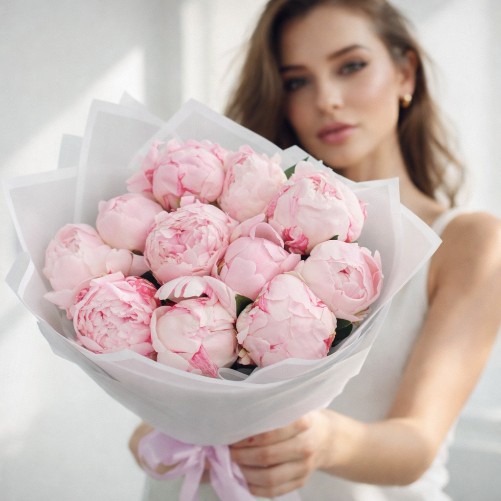 Розовые пионы "Sarah Bernhardt", атласная лента, упаковка