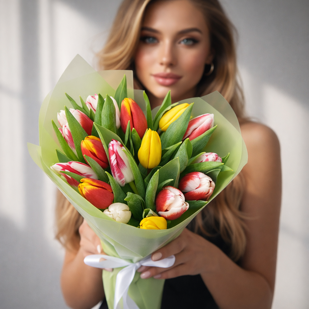 Тюльпаны микс (разных цветов в букете), упаковка, атласная лента