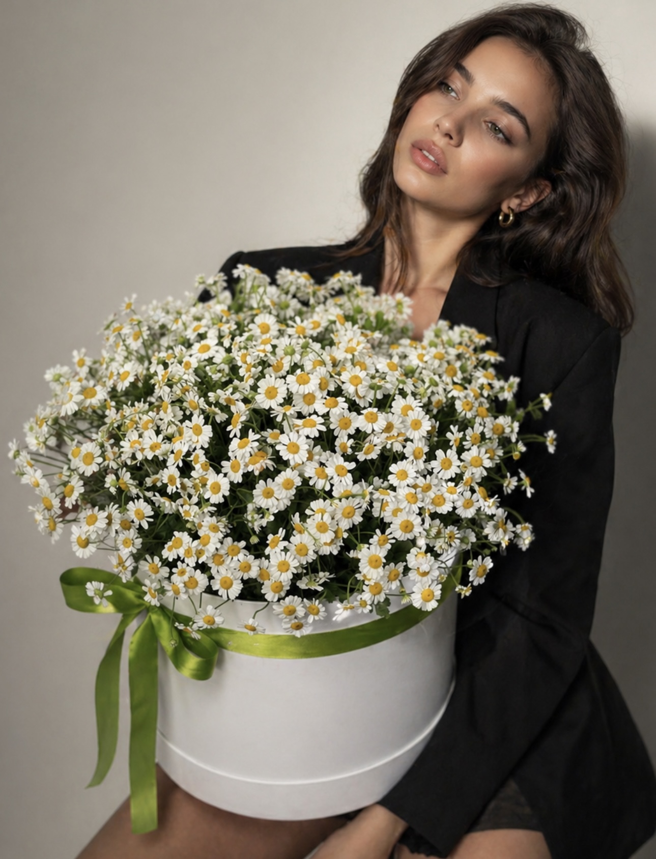 Chamomile Bliss — лёгкий и свежий букет из полевых ромашек в стильной коробке. Идеальный вариант, чтобы подарить искреннюю улыбку без повода.