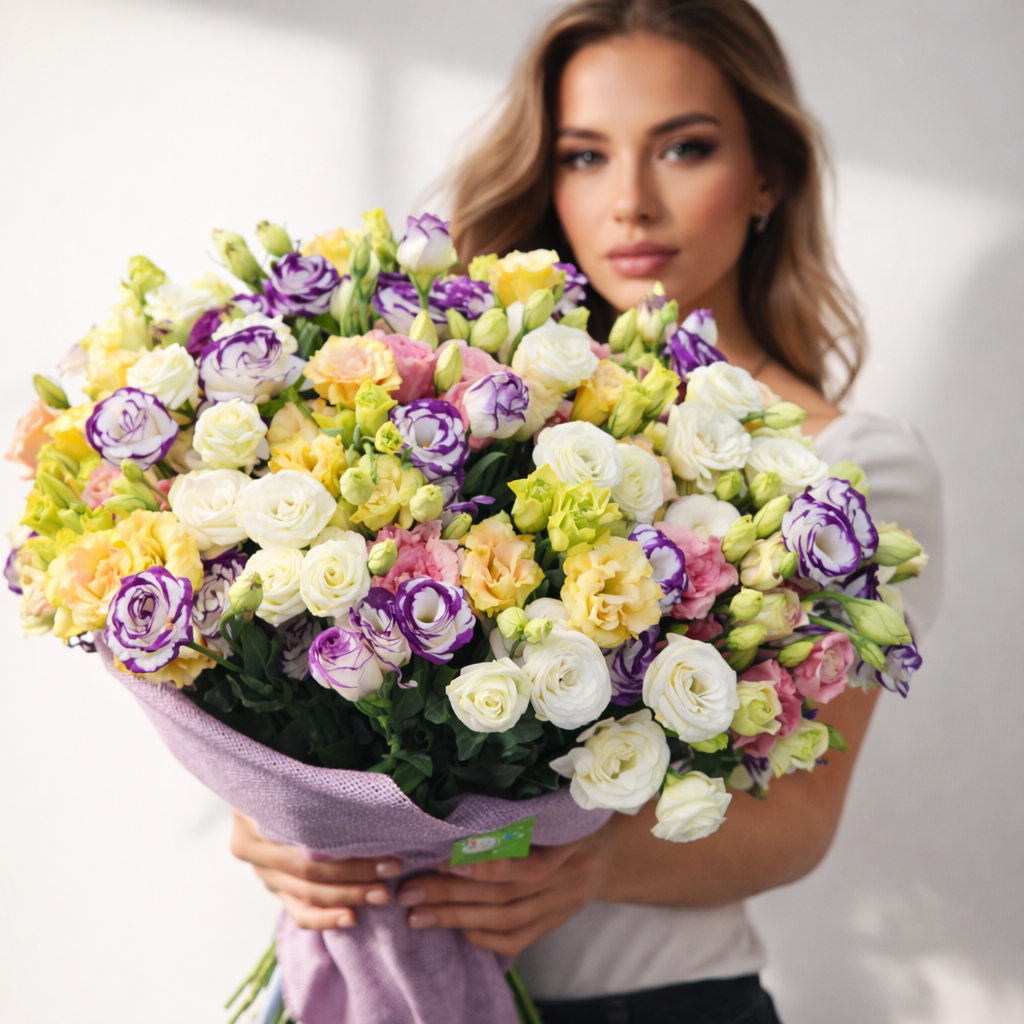Разноцветные лизиантусы (эустома), атласная лента