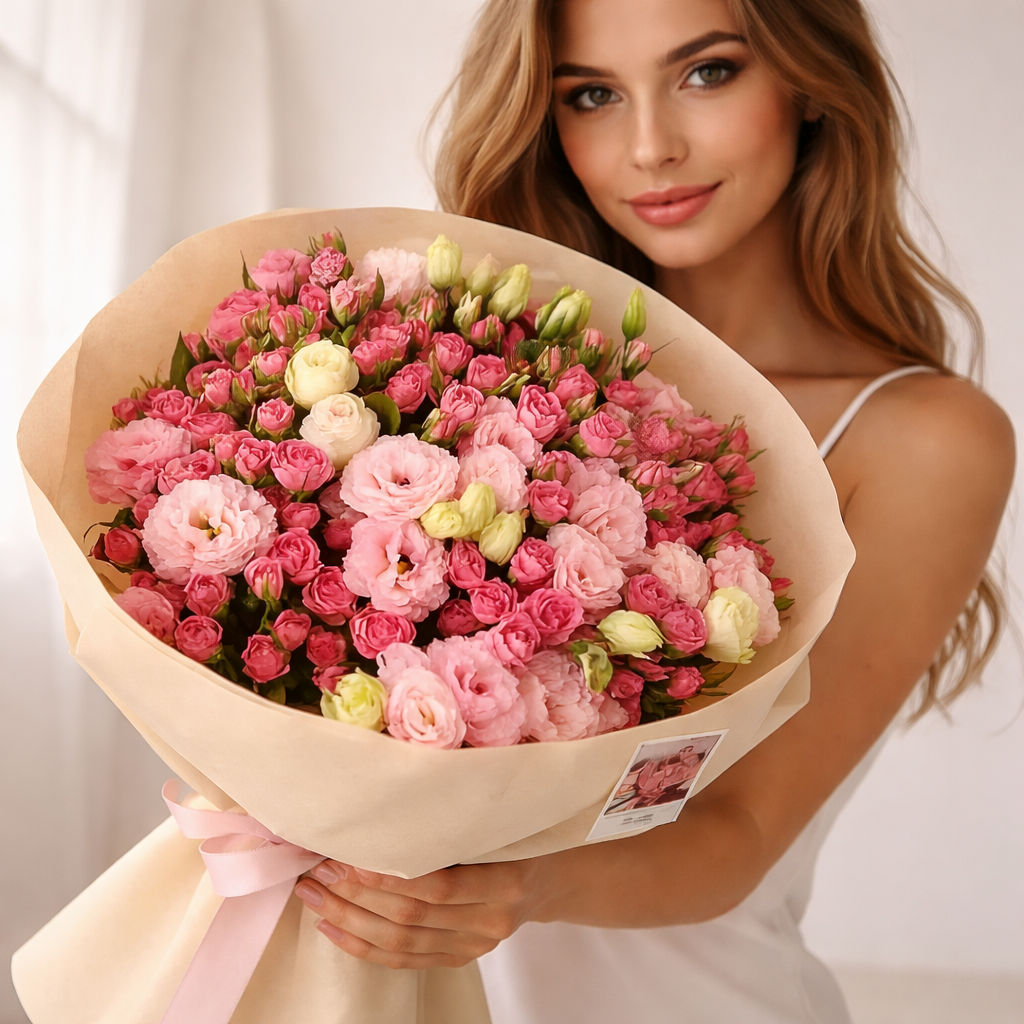Пышная и выразительная композиция в розово-пудровых оттенках, которая сразу притягивает взгляд. Нежные лизиантусы в сочетании с кустовыми розами создают объёмную, живую фактуру и мягкие переходы цвета от кремовых до насыщенно-розовых тонов.