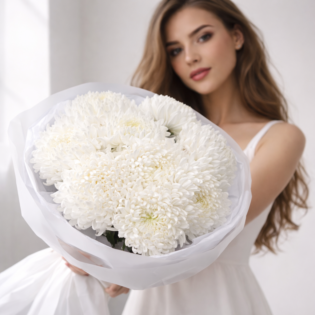 Лёгкий, как дыхание, и чистый, как первый снег — букет из девяти белоснежных хризантем станет символом искренности, нежности и гармонии.