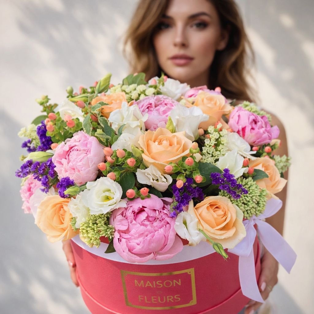 Пионы розовые "Sarah Bernhardt" 7 шт, розы кремовые 9 шт, статица, эустома 4 шт, гиперикум, декоративная зелень, подарочная коробка "Maison des fleurs"