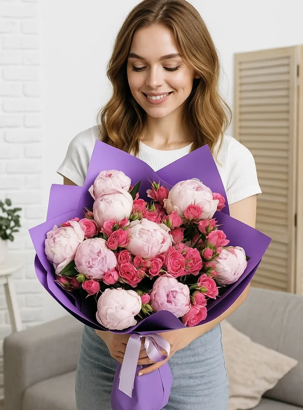 Пионы розовые "Sarah Bernhardt" 9 шт, кустовые розы 10 шт, декоративная зелень, упаковка, атласная лента