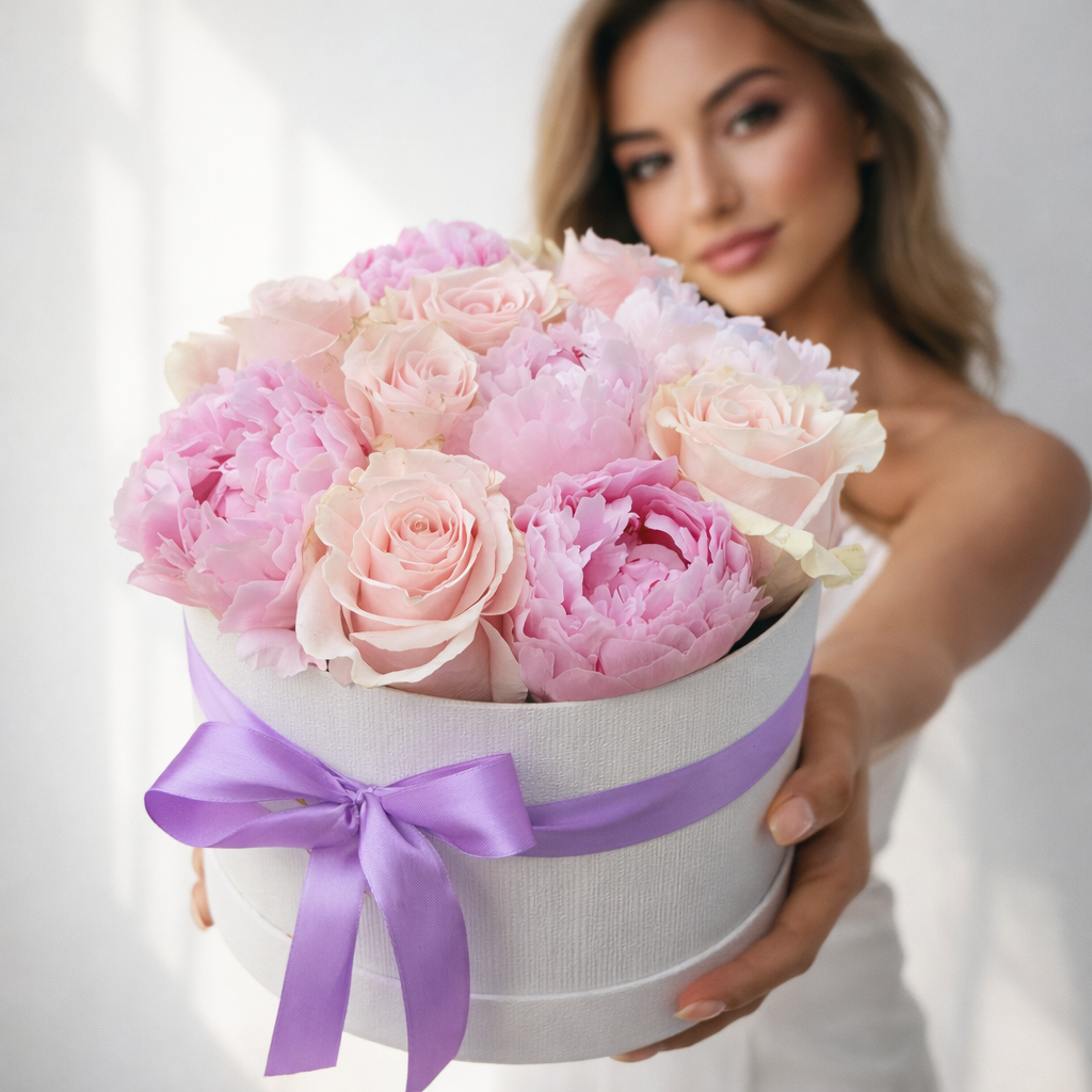 Пионы розовые 5 шт, розы 6 шт, белая подарочная коробка, атласная лента