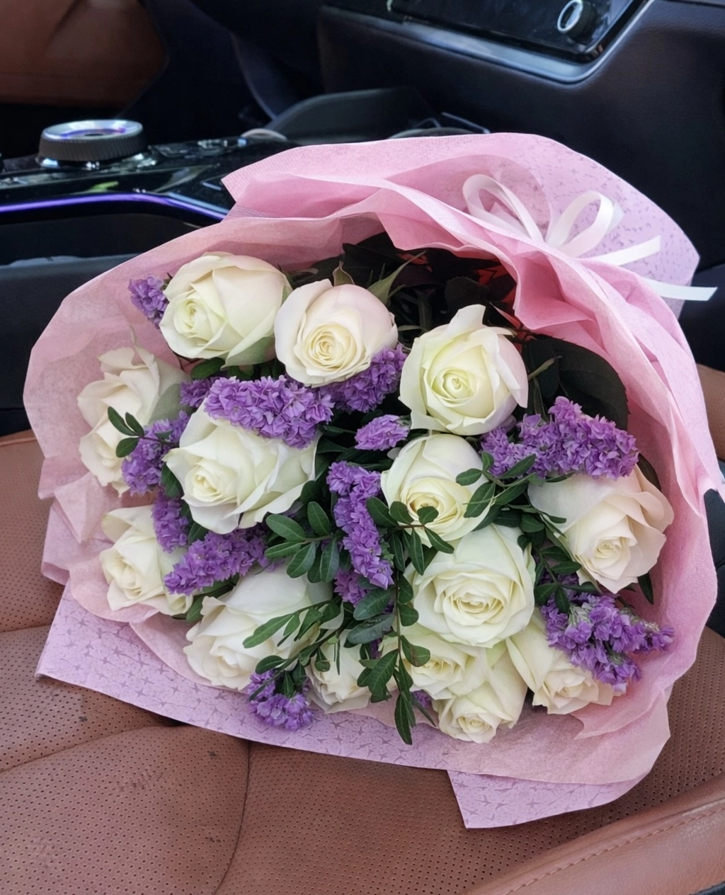 Белые розы 9 шт, 15 шт, статица розовая, упаковка