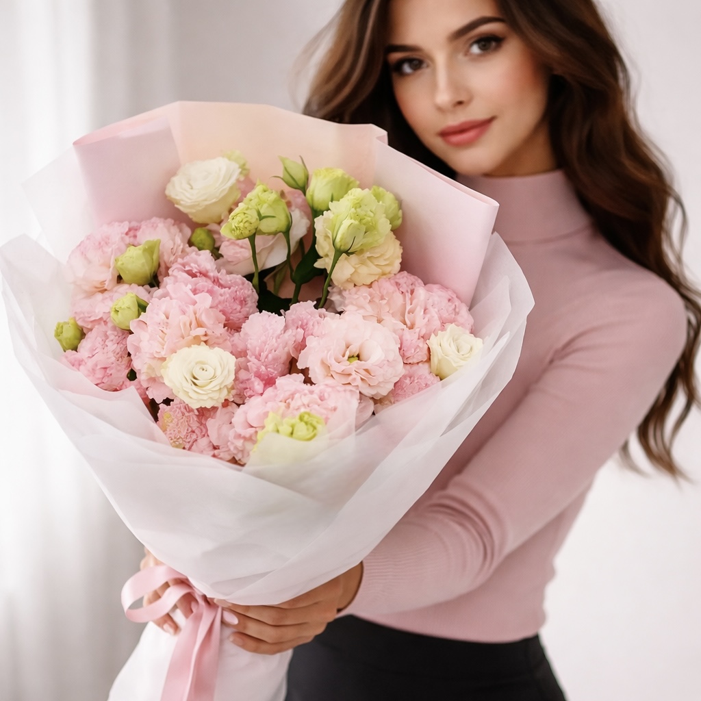 Розовая и белая эустома, упаковка, атласный бант
