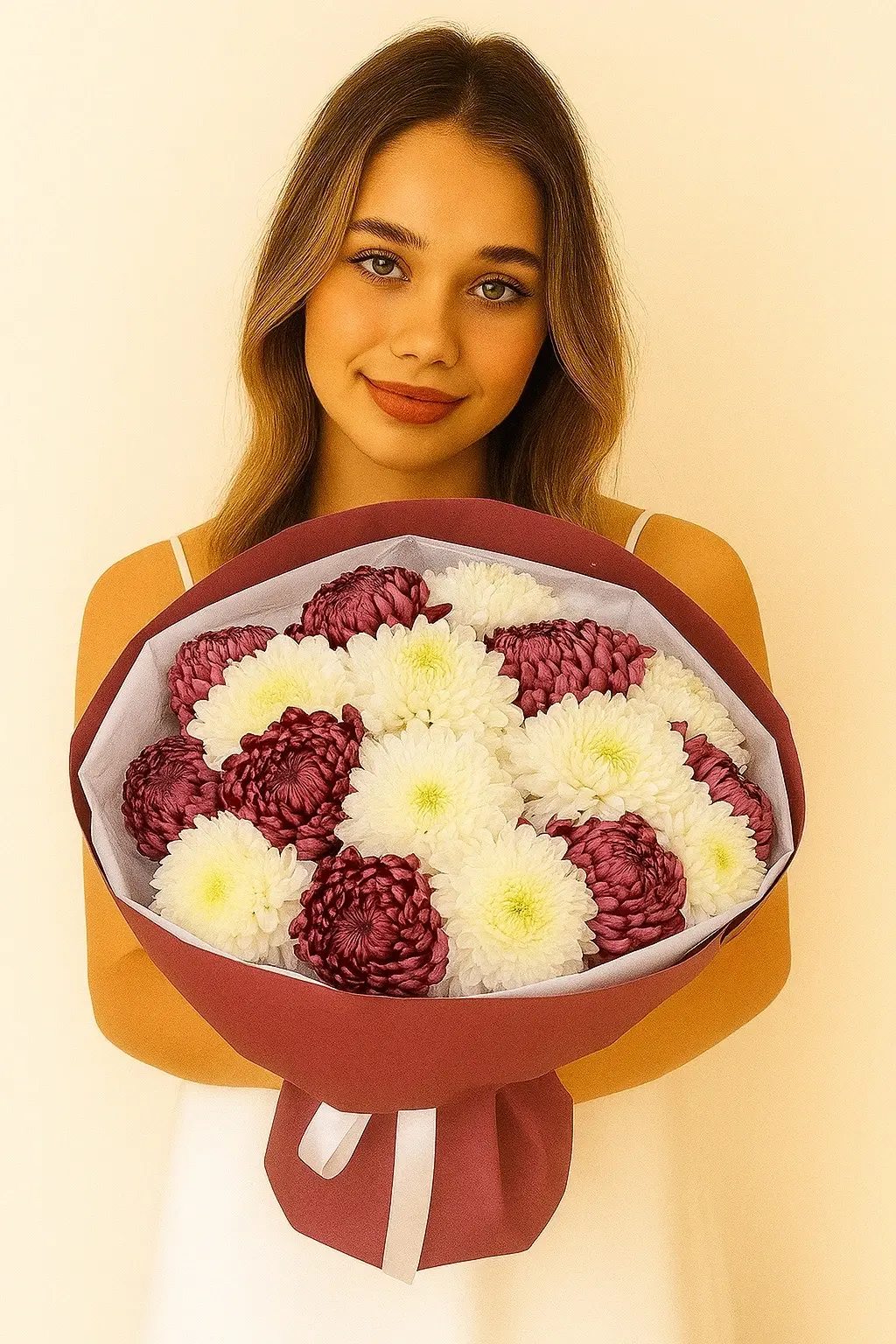 Белые хризантемы символизируют чистоту, искренность и свежесть чувств, а бордовые добавляют глубину, страсть и утончённость. Такая композиция подойдёт как для романтического признания, так и для элегантного поздравления.