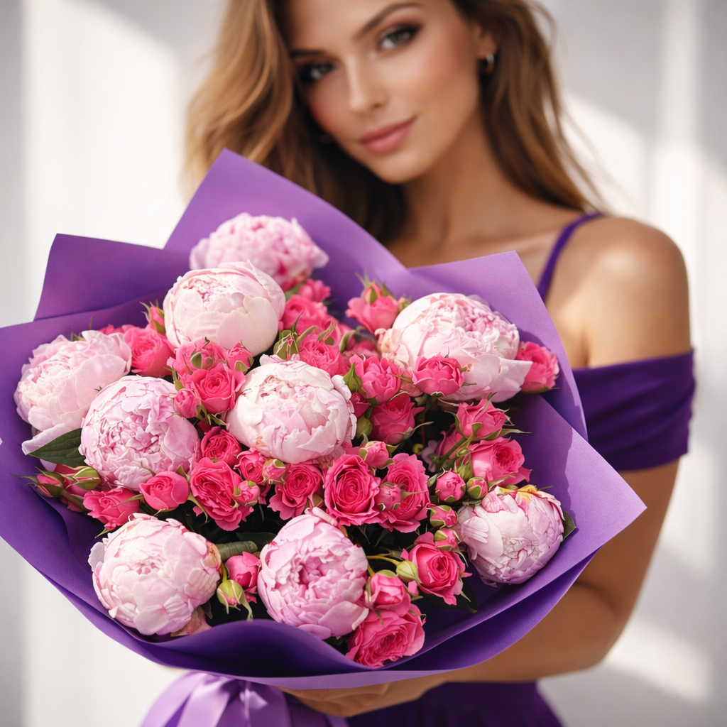 Пионы розовые "Sarah Bernhardt" 9 шт, кустовые розы 10 шт, декоративная зелень, упаковка, атласная лента