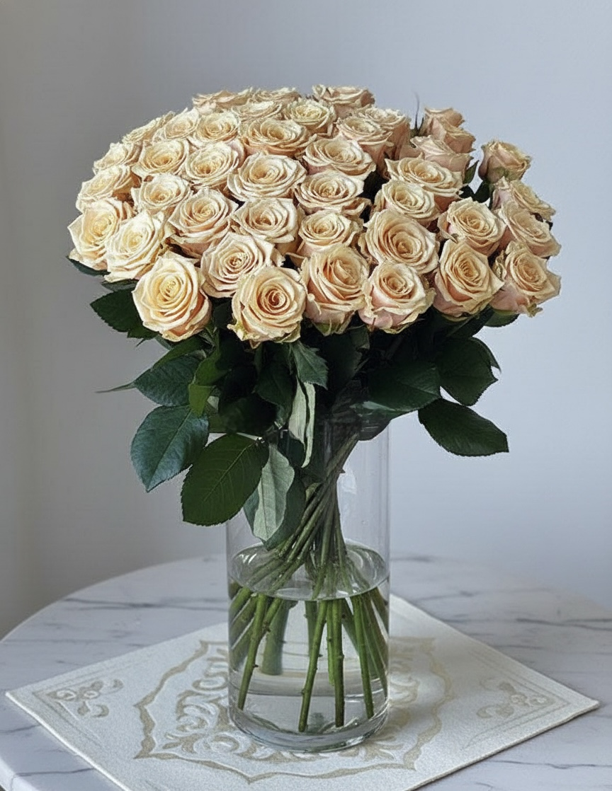 Изысканный букет из нежных кремовых роз сорта 'Bellini' – нежность в каждом бутоне. Подарите чарующую красоту и нежность этого букета вашим близким. Очарование природы, воплощенное в каждой розе.
