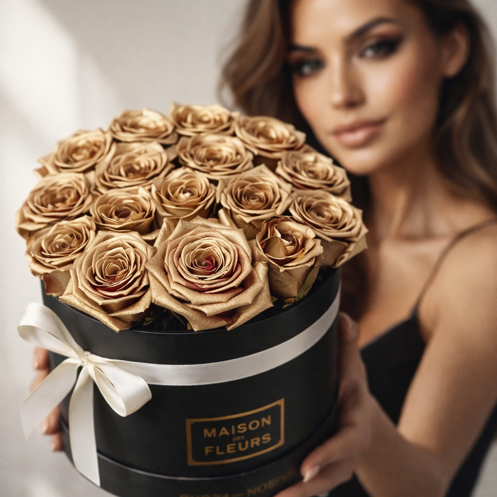 Золотые розы, черная подарочная коробка "Maison des fleurs", атласная лента