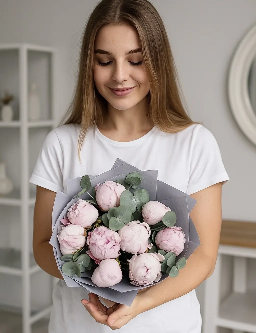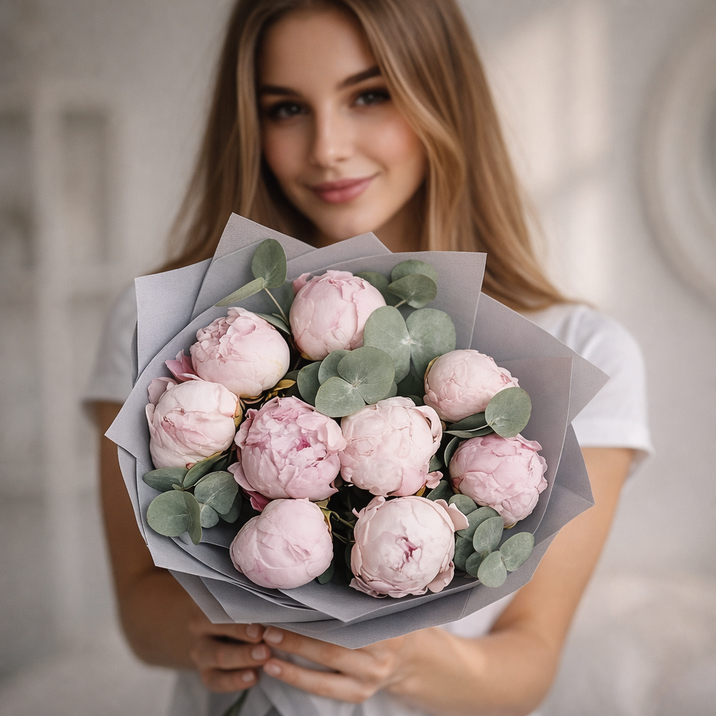 Розовые пионы "Sarah Bernhardt", зелень эвкалипт, атласная лента, упаковка